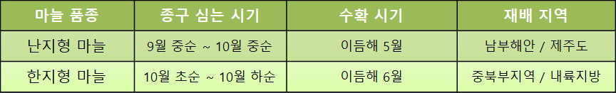 마늘 품종에는 대표적으로 남부지방에 심는 난지형 마늘과 중북부지방에 심는 한지형 마늘이 있습니다.