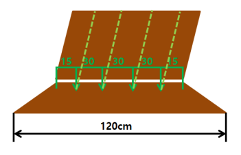 일반적인 두둑너비는 120cm가 적당하며 30cm 줄간격으로 4줄 심기로 해주면 됩니다.