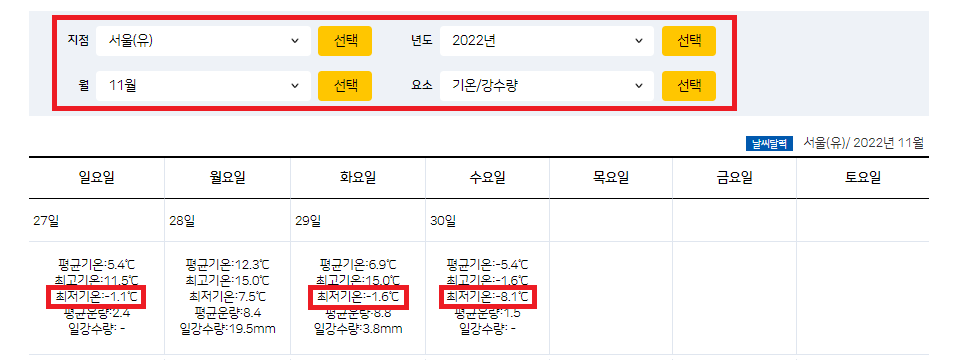 중부지역(경기/수도권)의 경우 작년 11월 27일 기준으로 영하 1℃ 아하의 온도가 시작되고 11월 30일부터 12월 동안 지속적인 영하권이 시작되기 때문에 11월 26일까지 수확을 한다고 생각하고 수확 계획을 잡으시면 됩니다.