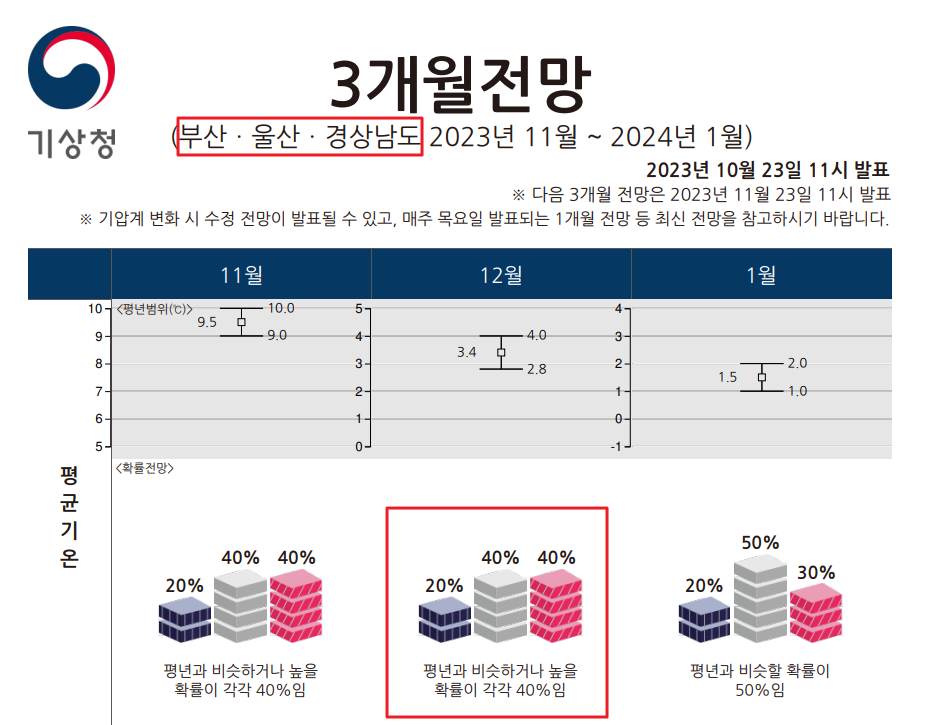 남부지역의 12월 기상청 전망 날씨를 보면 작년과 비슷하거나 낮을 확률이 40%로 작년 기상청 자료를 바탕으로 예상을 하며 수시로 실제 기상청 최신 자료를 확인하며 수확적기를 판단하여야 합니다.