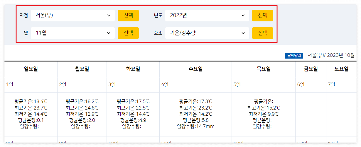 3. 지점(지역 설정), 년도(작년: 2022년), 월(11월, 12월) 설정하기