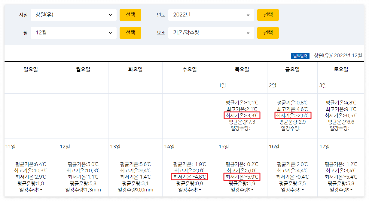 남부지역의 경우 작년 12월 1일 기준으로 영하 3℃ 아하의 온도가 시작되었지만 날씨가 다시 회복되었다가 12월 14일 기준으로 기온이 갑자기 내려가기 때문에 비닐 보양이나 다른 보양 대책이 되어 있다면 12월 13일까지 수확을 하셔도 무난합니다.