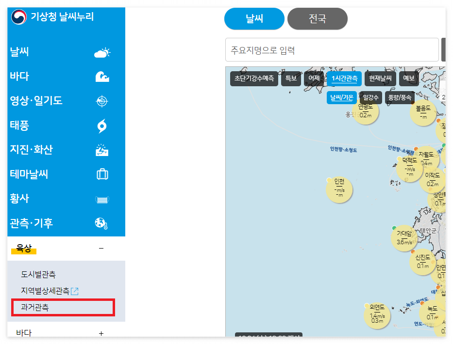 2. 좌측 메뉴 → 관측·기후 → 육상 → 과거관측 순으로 들어가기