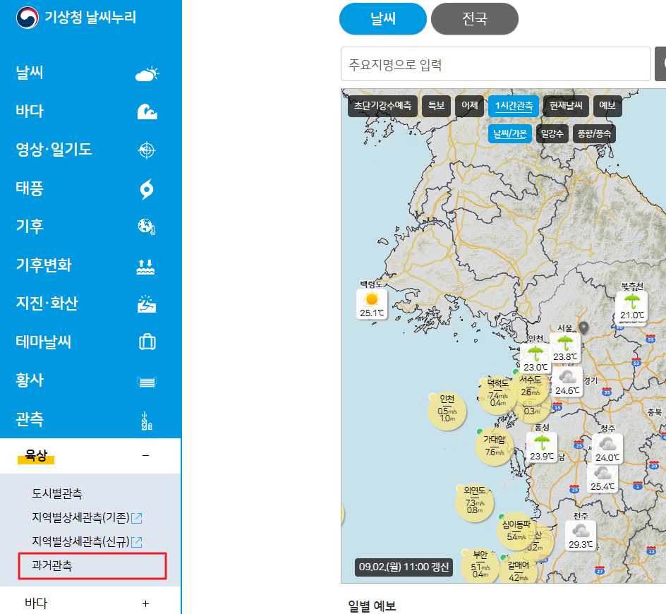 2. 좌측 메뉴 → 관측·기후 → 육상 → 과거관측 순으로 들어가기