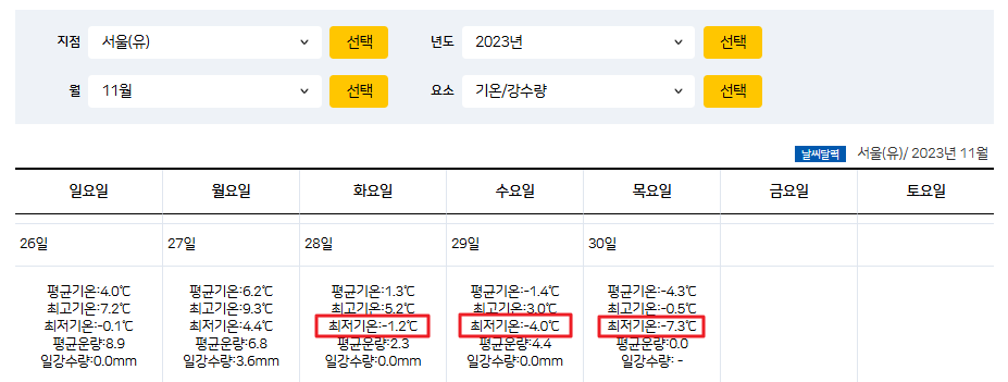 중부지역(경기/수도권)의 경우 작년 11월 28일 기준으로 영하 1℃ 아하의 온도가 시작되고 11월 29일부터 12월 동안 지속적인 영하권이 시작되기 때문에 11월 27일까지 수확을 한다고 생각하고 수확 계획을 잡으시면 됩니다.
