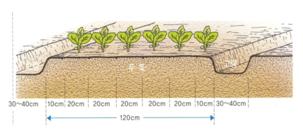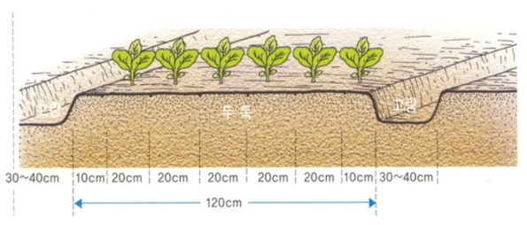 일반적으로 상추 두둑 폭은 120cm가 적당하며 두둑 높이는 30cm, 두둑 간의 거리는 40cm가 적당합니다.