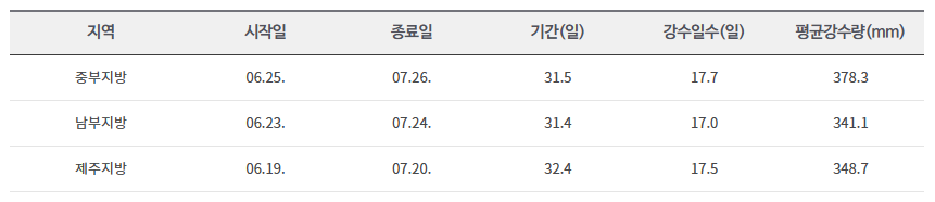 - 중부지방: 6월 25일 ~ 7월 26일