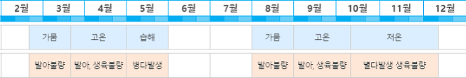3월과 8월에는 가뭄이 심한 달로 가뭄의 경우는 물 주기에 힘써야 합니다.