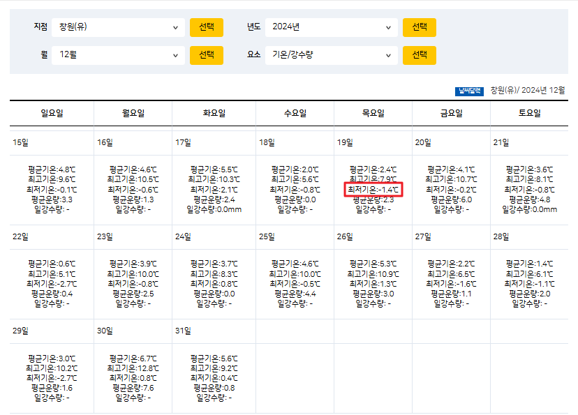 김장 작물 수확적기를 판단하기 위해서는 기상청에서 지역별 전년 날씨를 보고 예측하여야 합니다.
