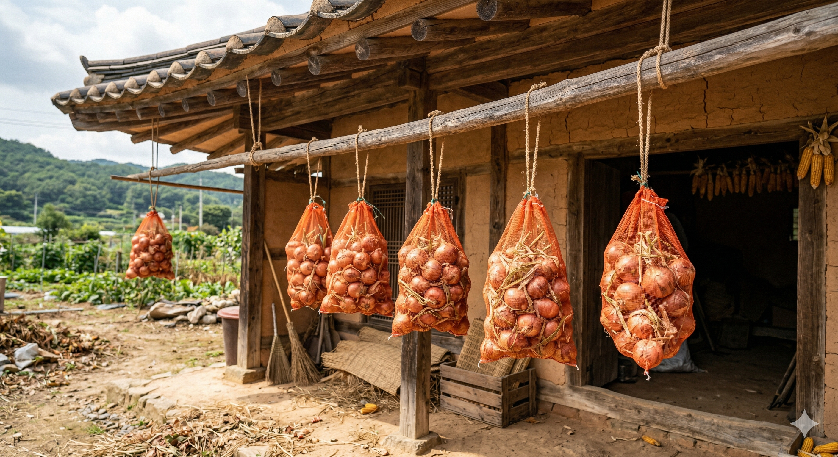 - 망에 매달기: 양파를 크기별로 골라낸 후, 망에 담아 서로 닿지 않게 공중에 매달아 둡니다.